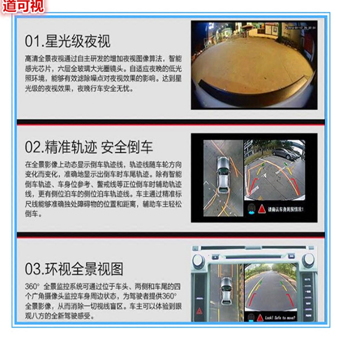 道可視1080P超清版360度全景行車輔助系統(tǒng)擁有更高的清晰度;軌跡線誤差小于5厘米;6大行車輔助功能,讓你行車更安全。我想大家不愿意遇到的就是當(dāng)有些強(qiáng)行變道剮蹭到自己愛(ài)車后逃之夭夭,原本以為行車記錄儀可以拍攝到車牌號(hào)碼,結(jié)果取證時(shí)卻發(fā)現(xiàn)只剩一片模糊...分辨率低、夜晚拍攝能力差,取景角度太小這些問(wèn)題一直都是不正規(guī)行車記錄儀為常見(jiàn)的問(wèn)題,貪一時(shí)便宜有時(shí)候損失可是相當(dāng)大的。