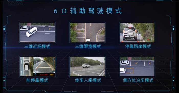 ◆6D輔助駕駛模式。道可視在2018年新增的6D輔助駕駛模式,包含三維近場(chǎng)模式、三維限寬模式、停靠路崖模式、前??磕J?、倒車入庫(kù)模式、側(cè)方位泊車模式,徹底屏棄掉市場(chǎng)上的其他3D模式,用簡(jiǎn)單方便實(shí)用的功能,輔助駕駛者順利通過行車障礙、過限寬、極限停靠路崖等多種復(fù)雜多變的行車環(huán)境及道路。