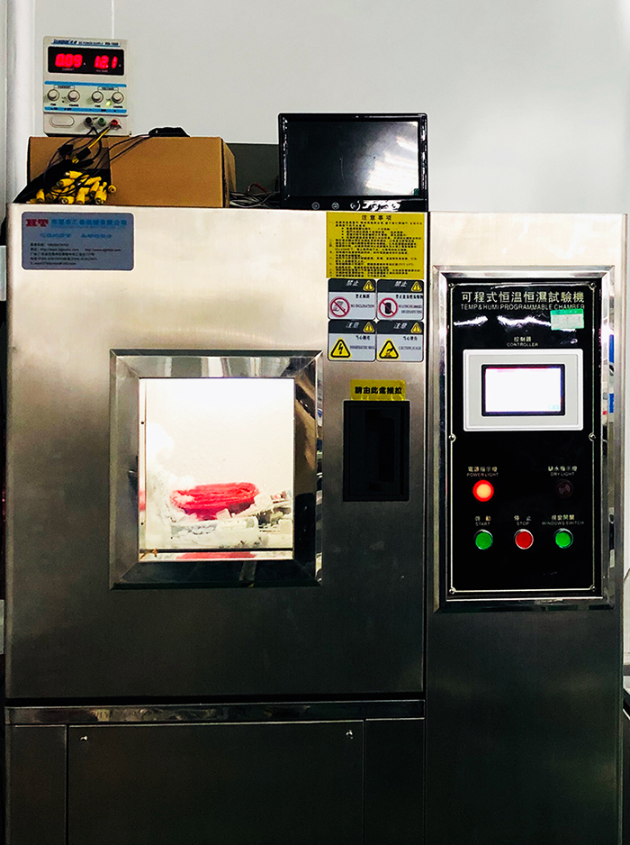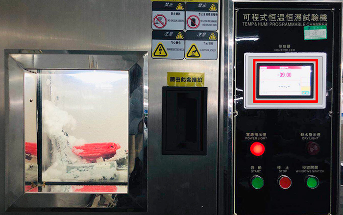 在道可視生產(chǎn)線眾多高科技的檢測(cè)工具中,不得不提可程式恒溫恒濕測(cè)試機(jī)。這臺(tái)機(jī)器24個(gè)小時(shí)全程處于開機(jī)狀態(tài),可以對(duì)機(jī)器的高低溫和耐濕度進(jìn)行測(cè)試。在下圖中,道可視360°全景行車輔助系統(tǒng)的幾塊主板已經(jīng)放進(jìn)了機(jī)器進(jìn)行了幾天時(shí)間的測(cè)試,溫度設(shè)置在了﹣40℃,在如此惡劣的低溫條件下,測(cè)試機(jī)內(nèi)已經(jīng)結(jié)滿了冰霜,但道可視的主板卻依舊“頑強(qiáng)”的亮燈工作著。
