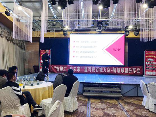 道可視代理商鄭州云游汽車銷售有限公司趙總率先進行道可視智慧聯(lián)盟店政策的主題講演,他表示,2019年道可視將在全國各省地級市舉辦多場招商會,共建立超4000家智慧聯(lián)盟店,他從門店產(chǎn)品的售前準備、售中執(zhí)行、售后服務三個層面進行了更細致化的闡述。